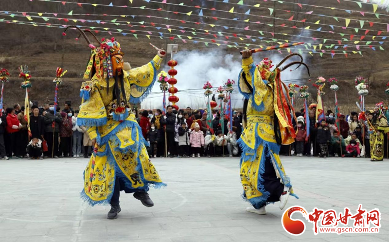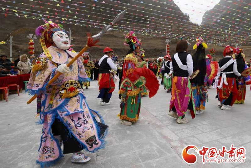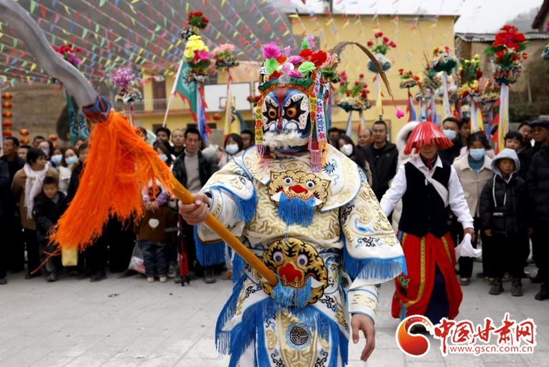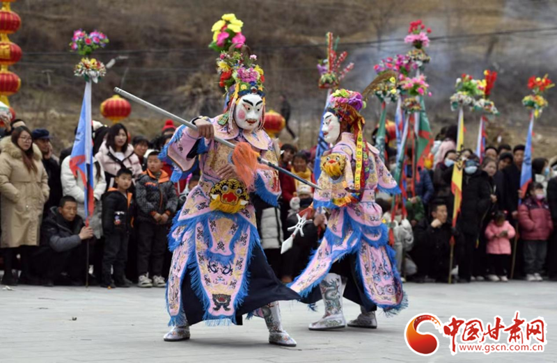 2024年2月19日,甘肅省隴南市武都區(qū)魚龍鎮(zhèn)柏家溝村,村民在表演當?shù)靥厣珓》N、國家級非物質文化遺產——高山戲。