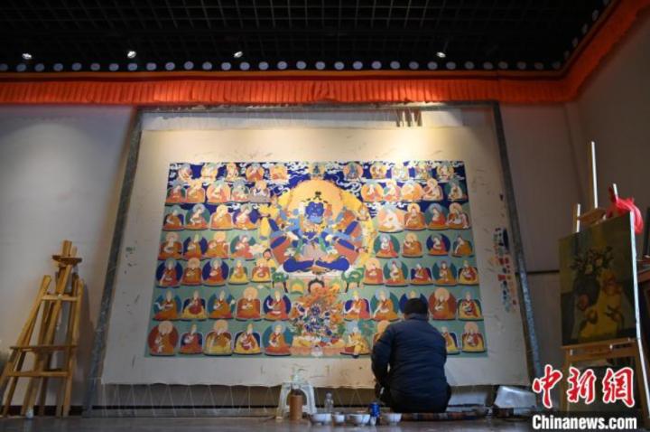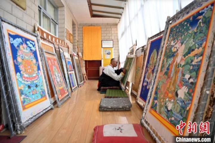 精品唐卡展廳展示甘南藏族唐卡國家級代表性傳承人交巴加布,及其父親的唐卡作品,常吸引游人“打卡”。(資料圖)中新社記者 九美旦增 攝