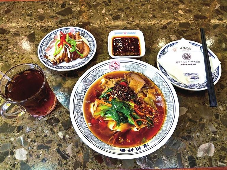 涼州,不僅有悠久的歷史、燦爛的文化,而且有回味無窮的美食。每天中午時分,位于雷臺綜合體的古凉韻“三套車”店里,食客絡繹不絕。從北京遠道而來的程先生一行四人,特地前來打卡武威的這道特色美食。一碗行面、一盤鹵肉、一杯茯茶的組合,讓他們吃得津津有味。