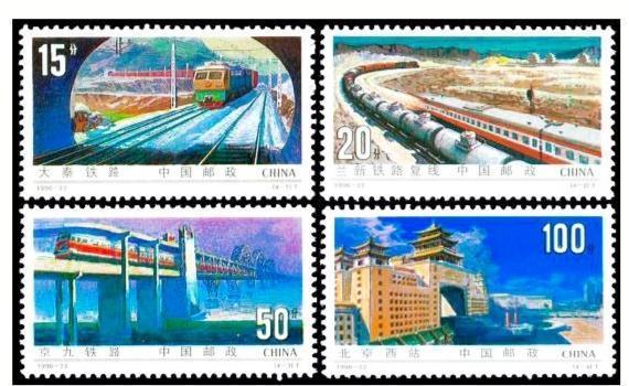 1996年9月,我國發(fā)行編號為1996-22的《鐵路建設(shè)》郵票一套四枚,其中T4-2圖為蘭新鐵路復(fù)線。票面上,一貨一客兩列火車蜿蜒在蘭新鐵路復(fù)線,氣勢如虹。而嘉峪關(guān)關(guān)城作為一個(gè)地理標(biāo)志,被處理成蘭新鐵路復(fù)線的背景圖案,放在郵票主圖的后方。盡管由于票面所限,背景圖案上的嘉峪關(guān)關(guān)城畫面很小,無以淋漓盡致地表現(xiàn)嘉峪關(guān)城樓的細(xì)節(jié),但其“天下第一雄關(guān)”的雄姿絲毫不減。而嘉峪關(guān)出現(xiàn)在表現(xiàn)甘肅特色乃至蘭新交通主線的票面上,也足見其地理位置的重要性。