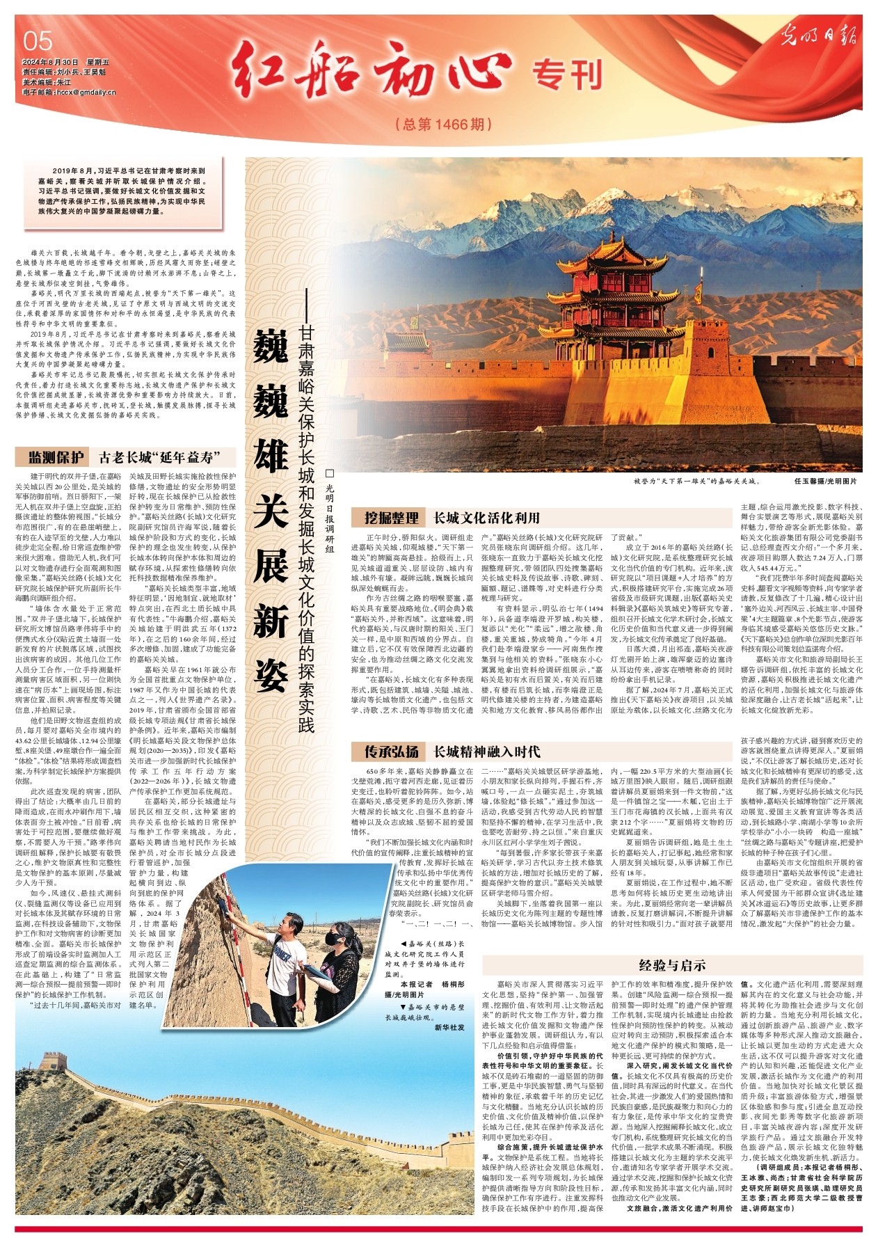 嘉峪關(guān)市牢記總書記殷殷囑托,切實(shí)擔(dān)起長城文化保護(hù)傳承時(shí)代責(zé)任,著力打造長城文化重要標(biāo)志地,長城文物遺產(chǎn)保護(hù)和長城文化價(jià)值挖掘成效顯著,長城資源優(yōu)勢和重要影響力持續(xù)放大。日前,本報(bào)調(diào)研組走進(jìn)嘉峪關(guān)市,撫磚瓦,登長城,觸摸發(fā)展脈搏,探尋長城保護(hù)修繕、長城文化發(fā)掘弘揚(yáng)的嘉峪關(guān)實(shí)踐。