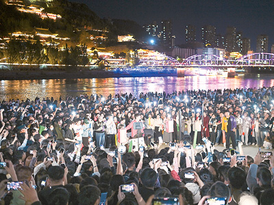 在黃河蘭州段近水平臺(tái),市民及游客參與蘭州黃河大合唱活動(dòng)?! ⌒氯A社記者 范培珅攝