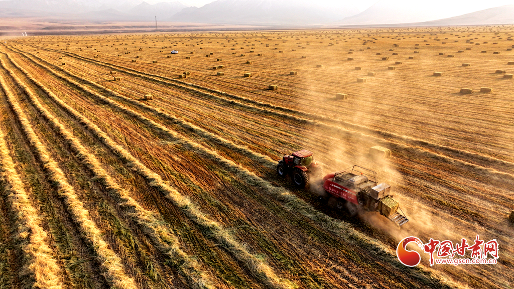 11月11日,甘肅山丹馬場的10萬畝燕麥草進入打包高峰期,田野上呈現(xiàn)出一派繁忙而有序的景象。放眼田間,大型農(nóng)用機械來回穿梭,將燕麥草迅速壓縮、打包,一個個草捆整齊排列。與此同時,滿載草捆的運輸車在田間小道上來回奔波,將成品送往倉庫和銷售地。