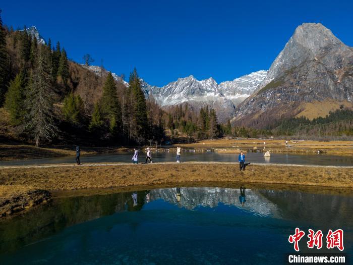 12月2日,位于四川省阿壩州小金縣的四姑娘山雙橋溝吸引游客游覽。隨著冬季到來,四姑娘山雙橋溝多座山峰被皚皚白雪覆蓋,紅葉、雪山倒映在清澈的湖面形成一幅美麗畫卷,冰雪旅游逐漸火熱。中新社記者 張浪 攝