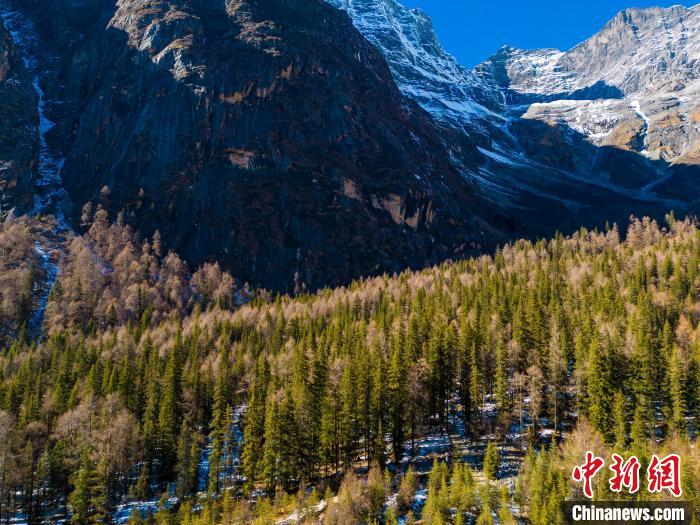 12月2日,四川省阿壩州小金縣四姑娘山雙橋溝,雪山與森林相映生輝。中新社記者 張浪 攝