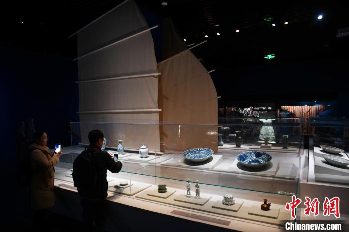 12月21日,“傳奇之旅:馬可·波羅與絲綢之路上的世界”展覽在四川博物院正式面向公眾開放。圖為觀眾參觀現(xiàn)場展出的中國元代青花瓷系列展品?!≈行律缬浾?nbsp;張浪 攝