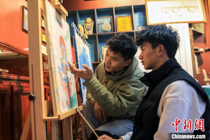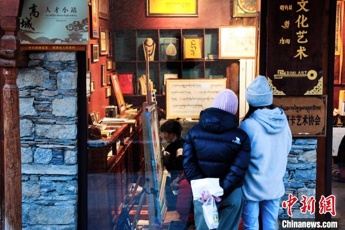 12月22日,在勒通古鎮(zhèn)的“唐卡館”,一位畫(huà)師繪制唐卡吸引游客駐足觀看。中新社記者 薛蒂 攝