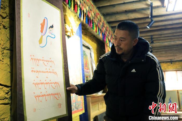 12月22日,藏文書(shū)法家昂旺曲批介紹自己的藏文書(shū)法作品。中新社記者 王磊 攝
