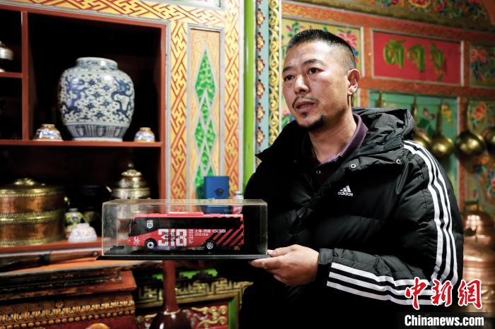 12月22日,藏文書(shū)法家昂旺曲批展示收藏的車模型。中新社記者 薛蒂 攝