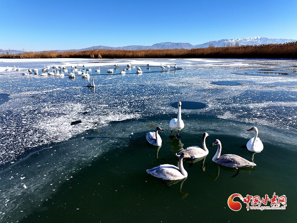近日,在甘肅省張掖國家濕地公園,成群的越冬天鵝在冰封的湖面上悠然覓食、嬉戲,構(gòu)成了一幅動人的生態(tài)畫卷,成為冬日里一道尤為引人注目的風景線。
