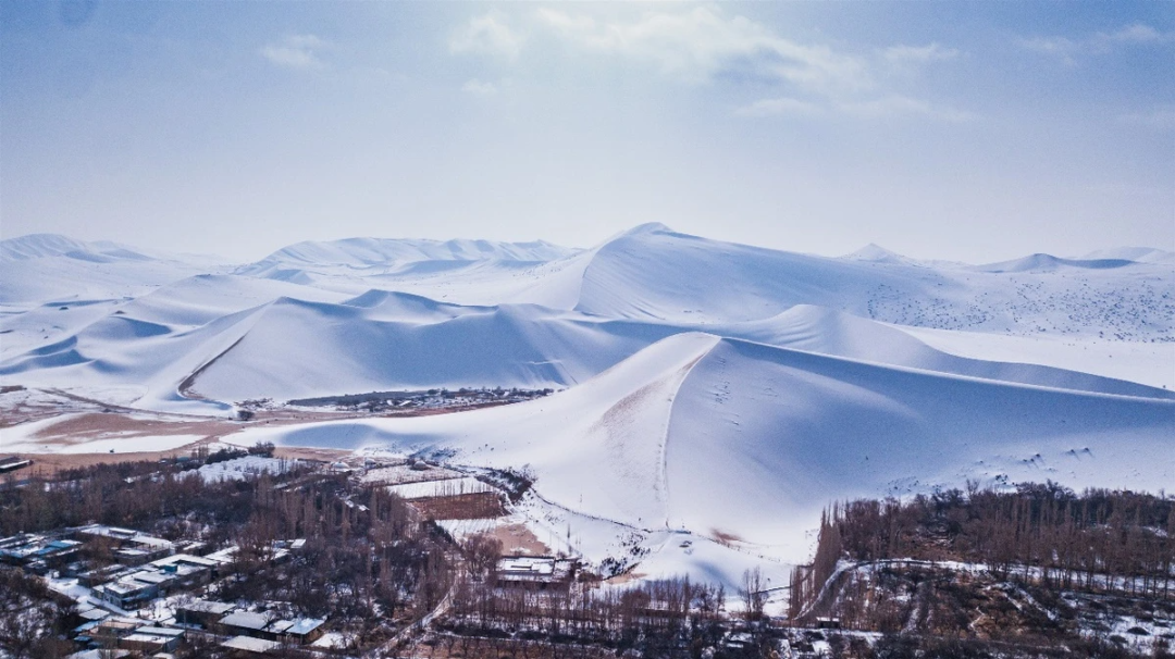 雪后的沙漠,以往那金波起伏、沙紋縱橫宛如流動樂章的山體,此刻被厚雪溫柔掩蔽,連綿峰巒似是大地涌起的雪浪。