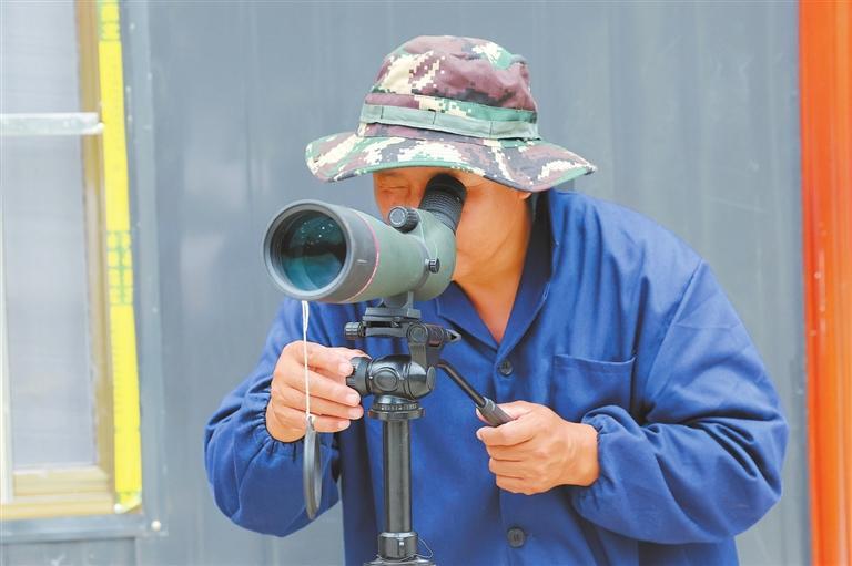 宋治平通過單筒望遠鏡觀察朱鹮。 新甘肅·甘肅日報記者 馮樂凱