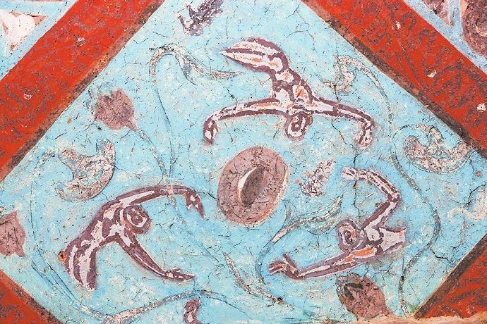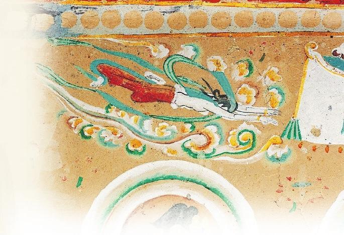 在許多人的認(rèn)知里,飛天是唯美曼妙的化身。在敦煌的許多壁畫中有大量的飛天形象,但是你知道嗎?在這些壁畫中除了凌空飛躍的飛天外,還有不少水中的飛天。在莫高窟第329窟壁畫中有一幅“潛水式飛天圖”:畫面中的一位飛天身著赭紅色長(zhǎng)裙,藍(lán)色飄帶纏身,雙手伸展前伸,似乎正在水中遨游。畫面唯美而靈動(dòng),在曼妙中透著健碩,使人過目難忘。