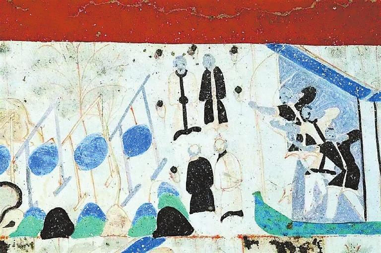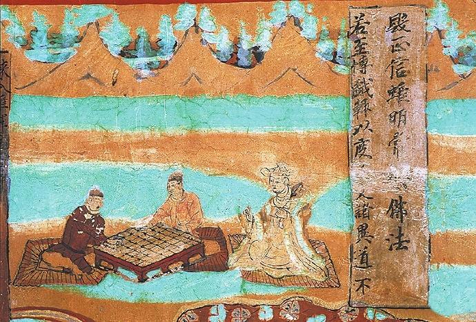 在敦煌壁畫中有關(guān)對(duì)弈的內(nèi)容較多。在莫高窟第454窟、第7窟壁畫中都有“弈棋圖”。兩幅圖的畫面有不少類似的地方:一是畫師較為突出棋盤的位置,兩幅壁畫中的棋盤都居中且形制相對(duì)巨大;二是畫面上的人物均為三人,兩人對(duì)弈,一人觀戰(zhàn),“觀棋不語真君子”;三是對(duì)弈者身后的景色都是天朗氣清、遠(yuǎn)山含黛。據(jù)說,一天,北宋大文豪蘇東坡與摯友黃庭堅(jiān)正在松樹底下弈棋。一陣風(fēng)吹來,松果掉進(jìn)棋盤。蘇東坡隨即吟道:“松下圍棋,松子每隨棋子落。”黃庭堅(jiān)馬上回答道:“柳邊垂釣,柳絲常伴釣絲懸。”雅趣十足。其實(shí),棋局里的一動(dòng)一靜、一招一式無不需要謹(jǐn)小慎微、穩(wěn)扎穩(wěn)打。而對(duì)弈時(shí)的當(dāng)斷則斷、示假隱真、有效合作等戰(zhàn)術(shù)不僅是對(duì)弈的智慧,也是人生的哲理吧。