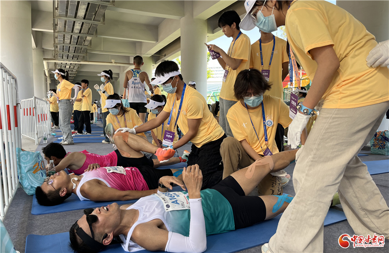 終點處,“蘭精靈”志愿者們向每一位沖出終點線上的跑者送去歡呼和鼓勵的話語,讓跑者們感受到認(rèn)可和贊揚,在精神上得到溫暖和力量。對于身體不適的跑者,志愿者們小心攙扶送往休息區(qū),由專業(yè)人員為他們提供必要的幫助;完賽物資領(lǐng)取處,志愿者們按照號碼牌快速分揀、發(fā)放物資,確保每一位跑者都能快速拿到完賽包。
