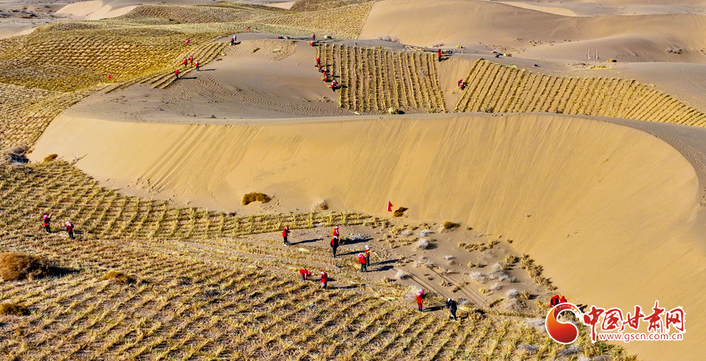 連日來,在張掖市肅南裕固族自治縣明花鄉(xiāng)西南部的干旱荒漠區(qū),運(yùn)草車輛往復(fù)穿梭,1600余名治沙工人于巴丹吉林沙漠西南緣的沙丘間忙碌作業(yè)。他們劃線、背草、俯身鋪草、揮鍬壓埋,全力營建沙障與固沙林帶,為沙漠牢牢“鎖邊”。