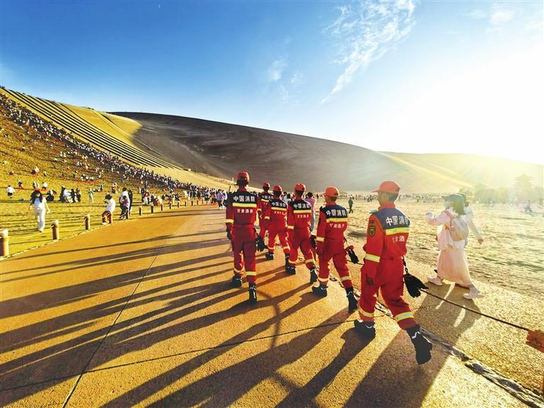 敦煌市消防救援大隊(duì)指戰(zhàn)員在鳴沙山月牙泉景區(qū)開展流動執(zhí)勤。