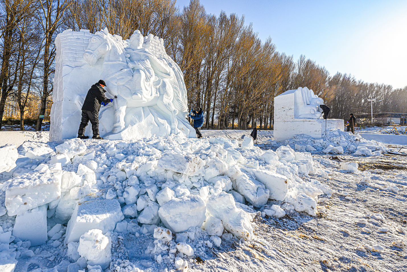 中國甘肅網1月13日訊 據嘉峪關日報報道(融媒體中心記者 李巍 攝)揚鏟塑造型,落刀雕精彩。1月10日,懸壁長城腳下,《昭君出塞》《九尾靈狐》《喜財神》等雪雕作品,在匠人們的精雕細琢中漸漸揭開“面紗”。