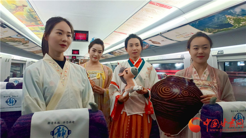 這趟列車,是敦煌研究院、甘肅省博物館、甘肅簡牘博物館、蘭州市博物館、天水市博物館、武威市博物館、平?jīng)鍪胁┪镳^、臨夏州彩陶館(州博物館)、和政古動物化石博物館九家國家一級博物館聯(lián)袂打造的“高鐵流動博物館”。