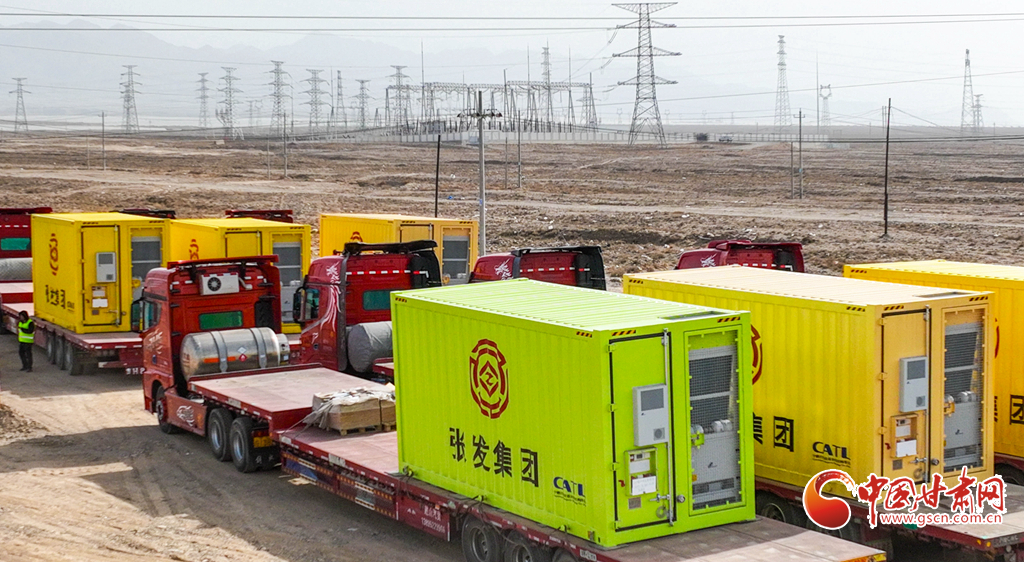 3月19日,張掖市山丹縣東樂灘上,大型運(yùn)輸車輛正在拉運(yùn)一臺臺“超級充電寶”。