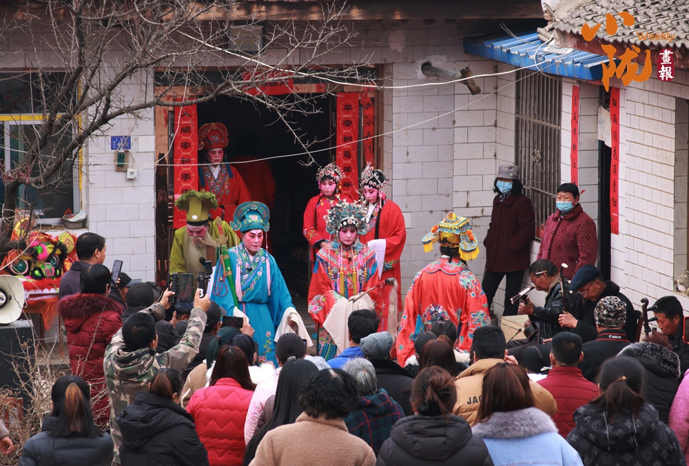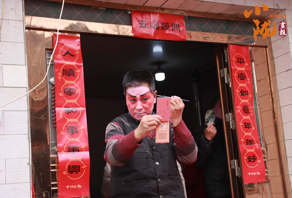 貼著紅春聯(lián)的屋門口,一位畫著戲曲臉譜的演員正對著手機調(diào)整妝容。這充滿鄉(xiāng)土氣息的戲曲準(zhǔn)備場景,滿是民間年俗里熱鬧又質(zhì)樸的煙火氣,也藏著傳統(tǒng)藝術(shù)在鄉(xiāng)土間的鮮活傳承。